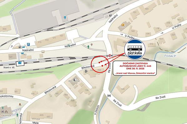 Upozorňujeme občany, že v neděli 30. 11. 2025 v čase cca od 14:00 do 21:00 hodin bude uzavřena část místní komunikace Nádražní, konkrétně v místě od křižovatky s ulicemi U Pošty x Ke Zvoli (od ostrůvku u hodin) až k bytovému domu Rajčur.