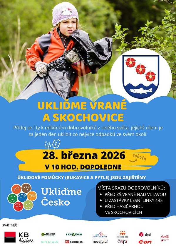 Obec Vrané nad Vltavou a Skochovice si vás dovolují pozvat na úklid obce v rámci celorepublikové aktivity „Ukliďme Česko 2026“. Přijďte nám pomoci zlepšit naše životní prostředí. Informace o termínu a místech srazu najdete v přiloženém letáku. Těšíme se a děkujeme vám za vaši pomoc při úklidu naší obce.